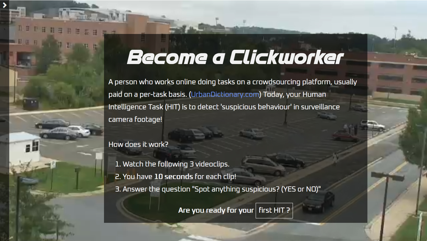In the artwork "Suspicious Behaviour" the visitor enters the world of hidden human labour, which builds the foundation of how 'intelligent' computer vision systems interpret our actions. Through a home office set-up and an image labelling tutorial the the visitor traverses into experiencing the tedious work of outsourced annotators. In an interactive tutorial for a fictional company the user is motivated and instructed to take on the task of labelling suspicious behaviour. The video clips in the tutorial are taken from various open machine learning datasets for surveillance and action detection. Gradually the tutorial reveals how complex human behaviour is reduced into banal categories of anomalous and normal behaviour. The guidelines of what is considered suspicious behaviour illustrated on a poster series and disciplined in the tutorial exercises are collected from lists of varied authorities. As the user is given a limited time to perform various labelling tasks the artwork provokes to reflect upon how easily biases and prejudices are embedded into machine vision. "Suspicious Behaviour" asks if training machines to understand human behaviour is actually as much about programming human behaviour? What role does the 'collective intelligence' of micro tasking annotators play in shaping how machines detect behaviour? And in which ways are the world views of developers embedded in the process of meaning making as they frame the annotation tasks?