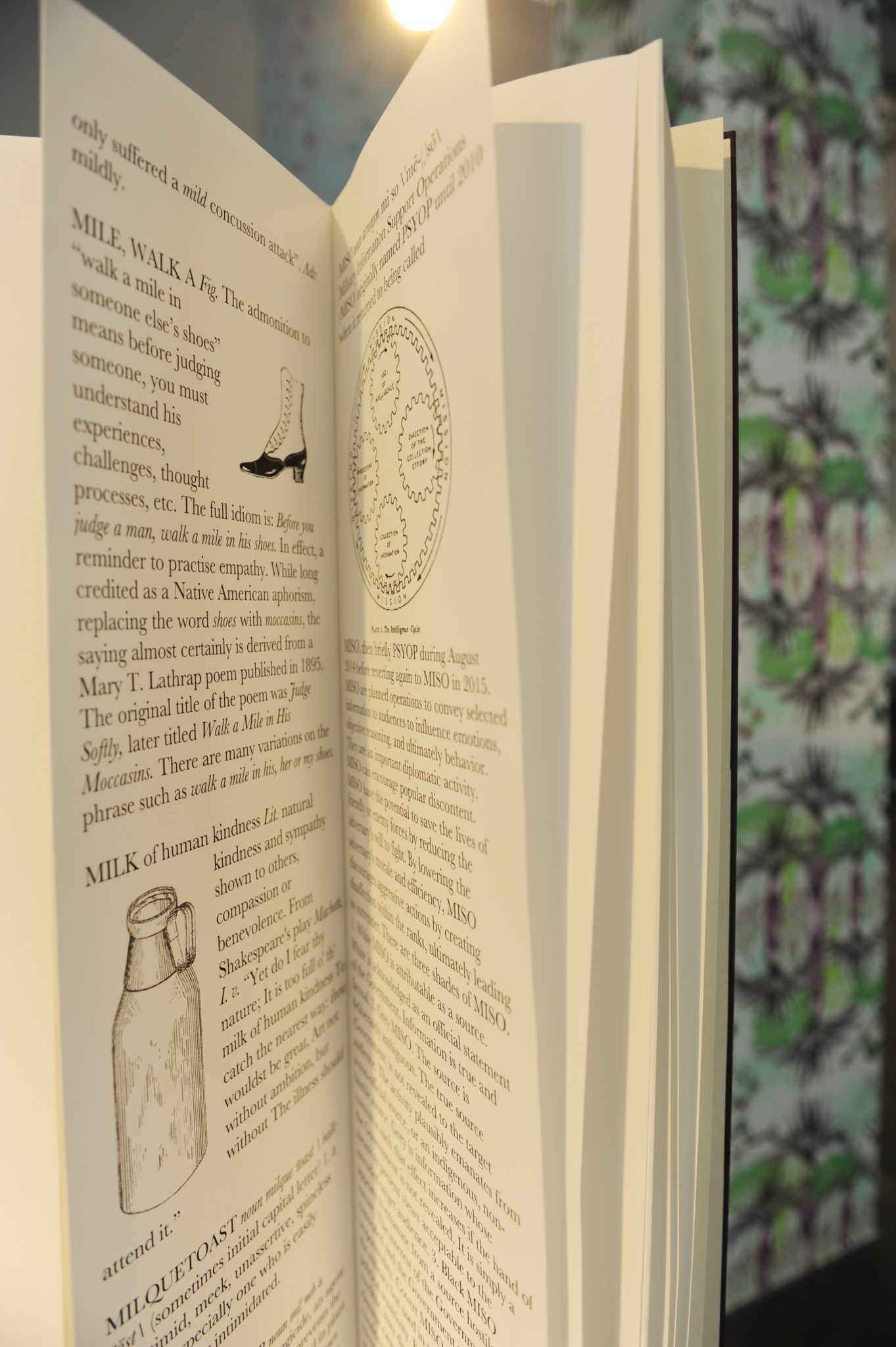 Das “Dictionary of Unexpected Generosities” ist ein Wörterbuch in ungewöhnlich großem Format in welchem nur zwei Seiten bedruckt sind. Darin werden Wörter aus dem täglichen Sprachgebrauch mit neuen Bedeutugnen aufgeladen, so wird beispielsweise aus “MISO” (von Miso-Suppe) “Military Information Support Operation”. Diese Arbeit stellt damit die Frage wie sich Bedeutungen in der Sprache konstituieren und wie diese kommuniziert werden.
